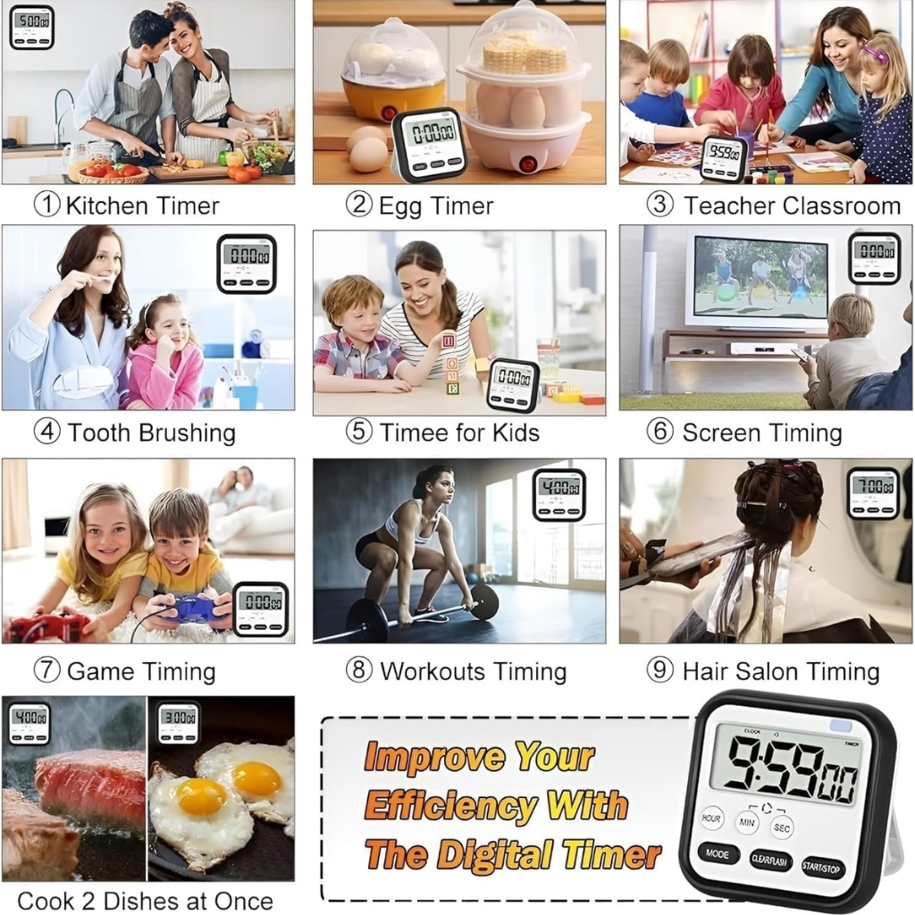 Perfect for a wide range of activities such as studying, cooking, workouts, and other timed tasks, this multi-purpose timer features simple and user-friendly controls, including stopwatch and countdown modes for smooth operation.